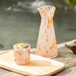 - Glass is integrated with warm pink and orange pellets for a one-of-a kind finish