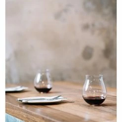 The Red B+ Stemless Wine Glasses from Plumm are designed for light to medium-bodied red wines like Pinot Noir and Nebbiolo and all other drinks. The RED B are based on the classic shapes of Plumm Vintage, without stems, making this set the perfect glasses for casual and relaxed settings. Enjoy the perfect sip of red as these glasses have a large bowl with a smaller opening, allowing you to capture more delicate floral and fruit aromas. These dishwasher-safe glasses can hold full-bodied red wines, cocktails, spirits, beer, water, or whatever else you want!