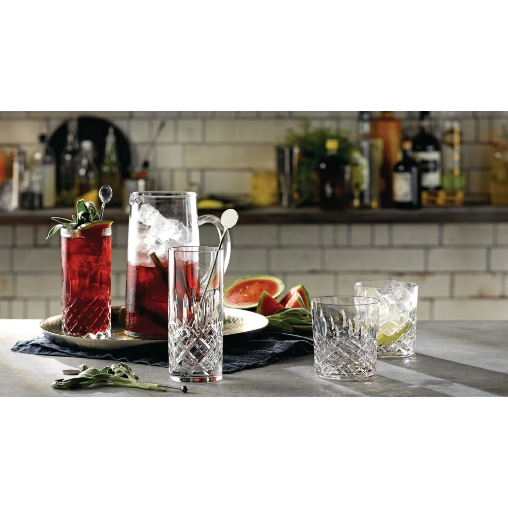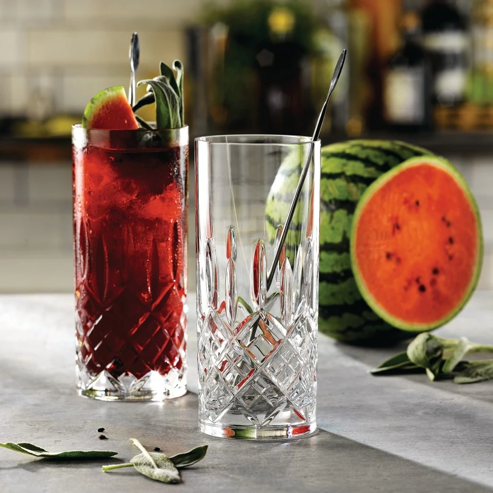 Add timeless elegance to your glassware collection with the Royal Doulton R&D Collection Pair of Highclere Highballs. Inspired by classic design, the Royal Doulton R&D Collection Pair of Highclere Highballs features a breathtaking arrangement of intersecting diamond and wedge cuts that showcases outstanding craftsmanship. Crafted from premium quality lead crystal, each tumbler boasts incredible clarity and brilliance that catches the light, beautifully enhancing the colours of the drink within. Enjoy the musical chimes of ice cubes clinking against the satisfyingly heavy crystal as you sip on a simple gin and tonic or a carefully crafted seasonal creation. Perfect for fashioning your sophisticated dream home bar, the Royal Doulton R&D Collection Pair of Highclere Highballs comes packaged in a sleek gift box making them a fabulous choice for giving on weddings and other special occasions.