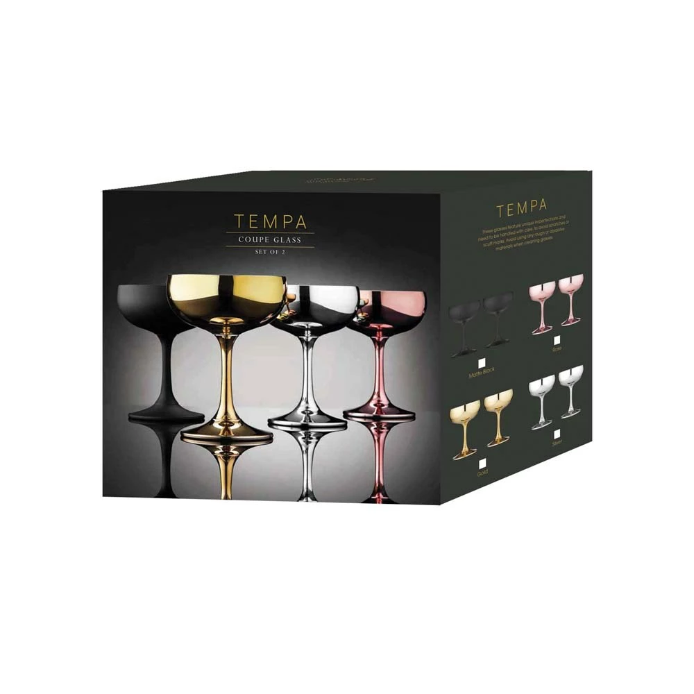 Entertain in style with the luxurious Aurora Collection. Perfectly designed to impress your guests, this range features a range of glassware and cocktail items- everything for the cocktail enthusiast. Constructed of the highest quality glass and with a unique electroplated outer, the Tempa Aurora Set of 2 Coupe Glasses boast a luxurious metallic finish that will elevate the drinks you serve to the next level. Recognised for their sleek and minimalist aesthetic, Tempa brings you quality, function and luxurious modern design. Packed for gifting, the Tempa Aurora Coupe Glasses are an excellent gift for weddings, birthdays, and other events. Complete the glass cabinet by combining the coupe glasses with the Tempa Aurora Set of 2 Gin Glasses Silver.